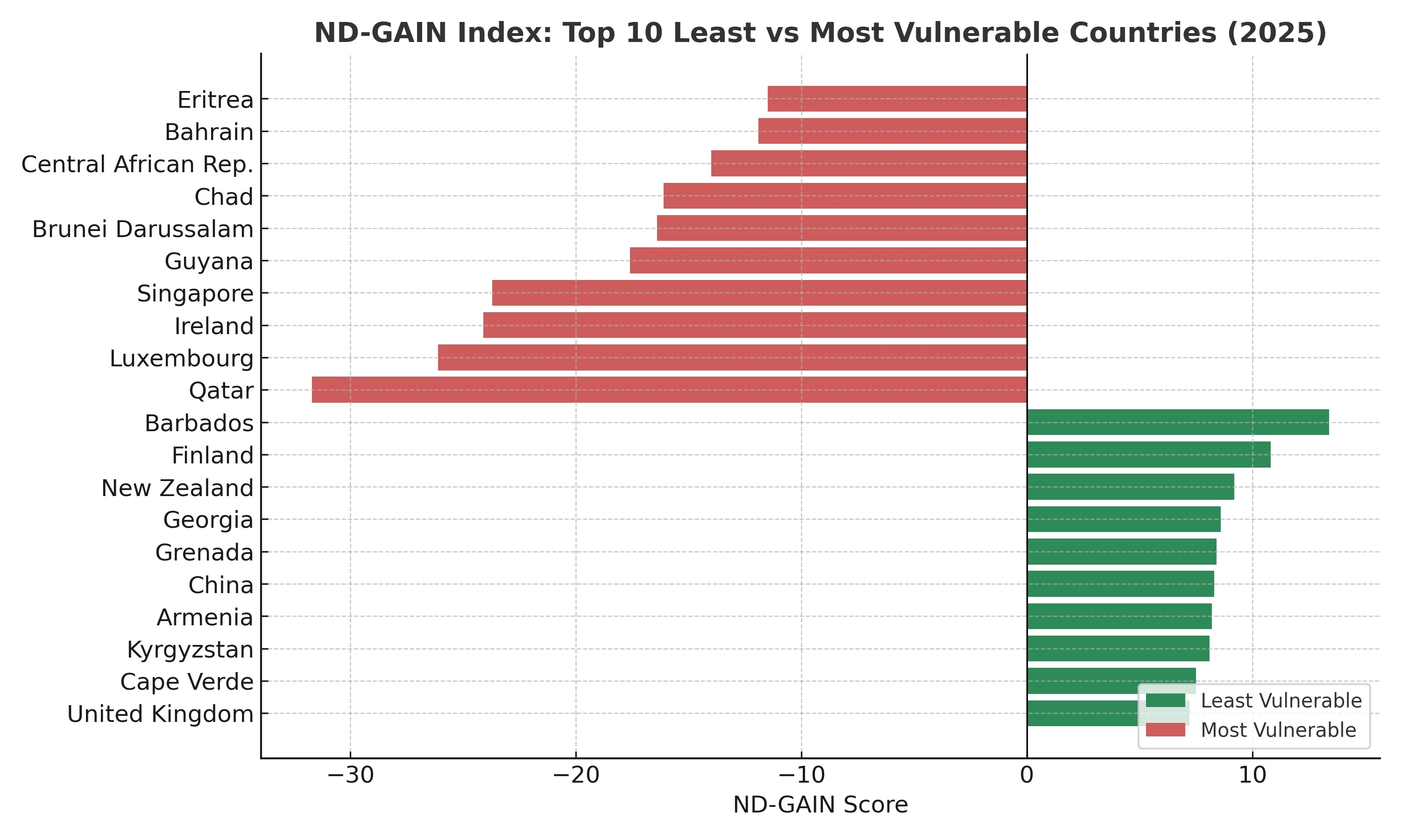 Figure 2: ND-GAIN Index – Top 10 Least and Most Vulnerable Countries (2025). Source: Notre Dame Global Adaptation Initiative (ND-GAIN), 2025 Country Index Rankings.