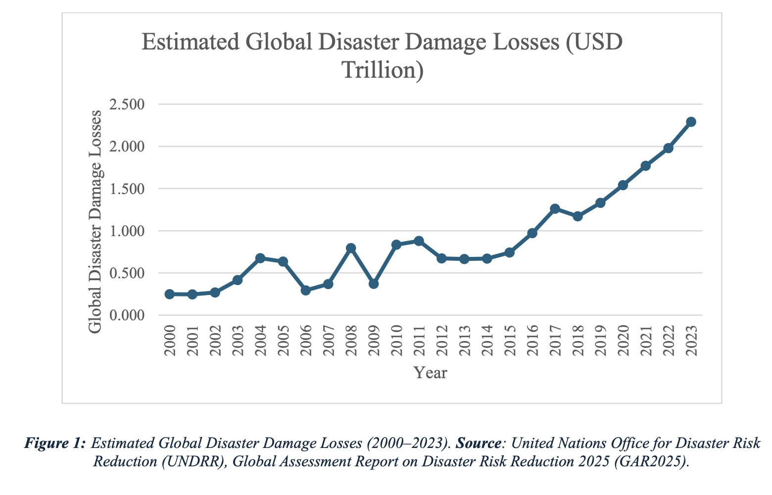 Nevertheless, the full financial toll of these disasters is often vastly underestimated. According to the Global Assessment Report on Disaster Risk Reduction (GAR, 2025), while direct losses now exceed $202 billion annually, the true cost, including cascading effects, ecosystem degradation, and long-term social impacts, could exceed $2.3 trillion (Figure 1). To put this into perspective, a national debt of just $300 billion was enough to trigger the European sovereign debt crisis. Disaster risk is no longer a localised issue; it is now a systemic threat to global financial stability. The urgency of action is echoed by United Nations Secretary-General António Guterres, who stated: